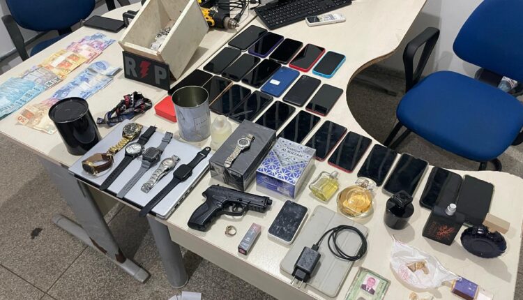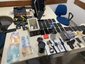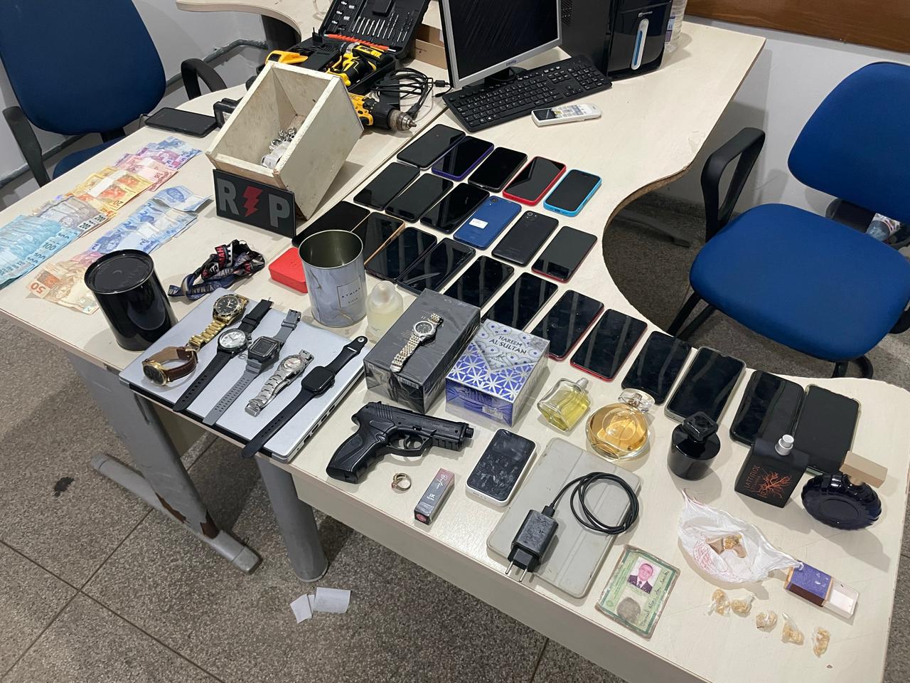 As diligências se estenderam ao local da abordagem, à residência do investigado e a um bar indicado como ponto de comercialização de drogas. Nos locais, os policiais apreenderam R$ 3.810,00 em dinheiro, valor que seria proveniente do tráfico, além de um simulacro de arma de fogo tipo pistola, uma munição calibre .38, aparelhos celulares, relógios, bijuterias, perfumes, quatro furadeiras, caixas de som, um notebook, um iPad e uma máquina de cartão.