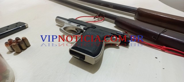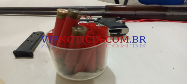 Os policiais chegaram no local, constataram a veracidade da informação, e durante o procedimento de checagem no local os policiais encontraram, três armas de fogo, sendo uma pistola Beretta 380, uma espingarda calibre 36 e outra 32.