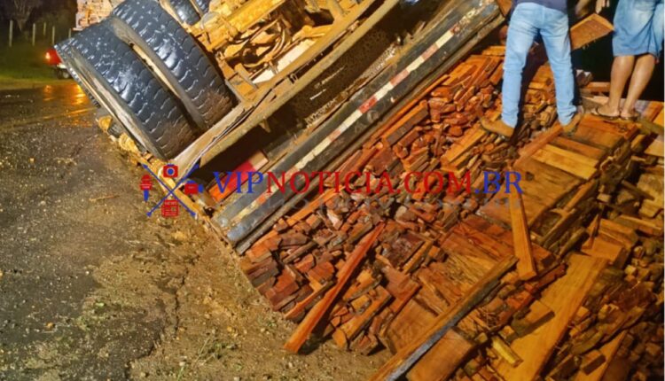 Caminhão com carga de madeira tomba reboque e provoca acidente na Linha 128, próximo à entrada da Linha 90