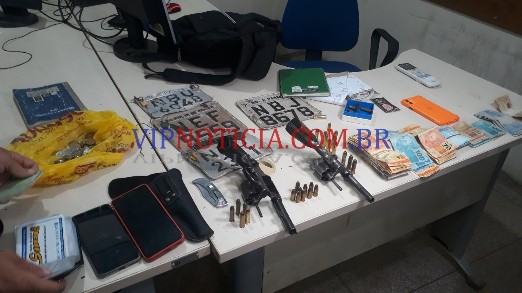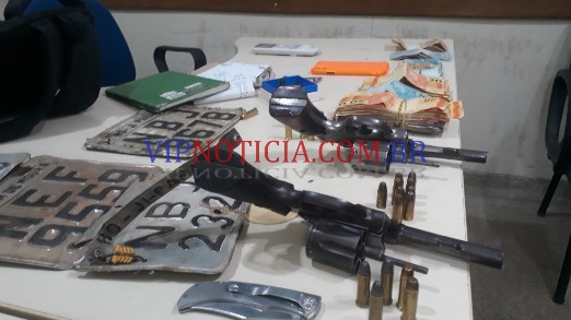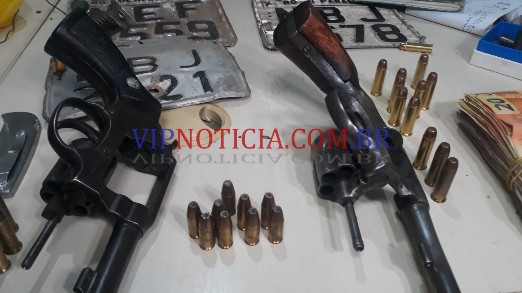 Durante os trabalhos policiais foram localizados dois revólveres calibre 38, municiados, várias munições intactas e algumas deflagradas e a quantia de doze mil reais em espécie.