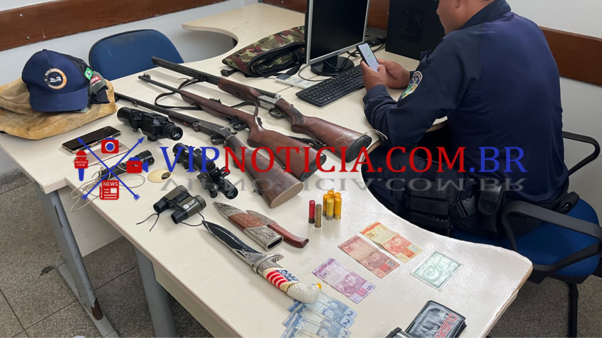 Nas buscas, os policiais recuperaram três armas de fogo — duas pertencentes à vítima e uma sem identificação — além de cartuchos e outros pertences levados da propriedade rural.
