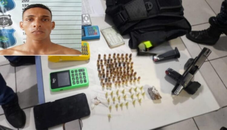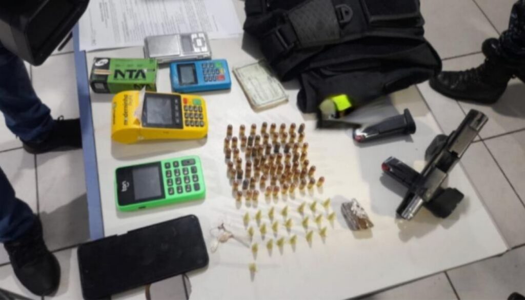 Em revista no apartamento foram apreendidos várias munições, porções de droga tipo maconha, uma pistola, um colete balístico e máquinas de cartão para a venda dos entorpecentes.