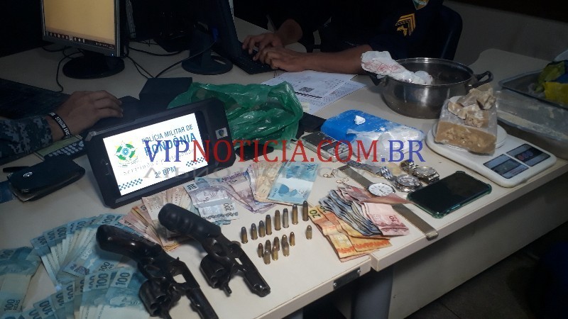 onde foi efetuada uma varredura no imóvel, sendo localizado duas armas de fogo, sendo elas calibre 38, e quase 2kg de drogas e vários