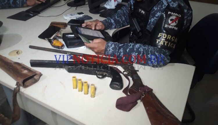 A guarnição do Raio conduziu dois indivíduos e apreendeu duas armas de fogo na rua Amapá, entre T-13 e T-14, bairro Val Paraíso, segundo distrito de Ji-Paraná.