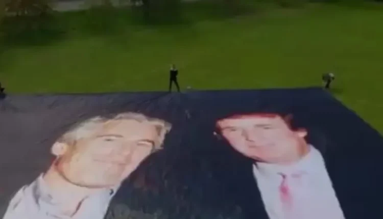 Uma imagem gigante de Donald Trump ao lado de Jeffrey Epstein foi exposta, nesta segunda-feira (15), junto ao Castelo de Windsor, no Reino Unido, onde o presidente dos Estados Unidos se vai encontrar com o rei Charles III na visita ao país.