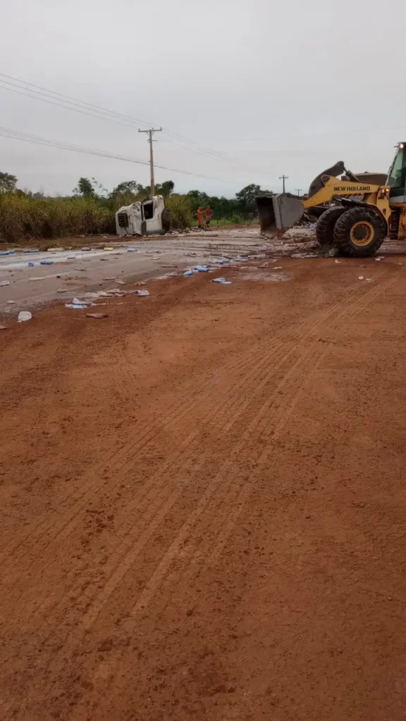 De acordo com relatos, a carreta carregada com amaciante perdeu o controle e colidiu com outras duas carretas que estavam estacionadas às margens da rodovia.