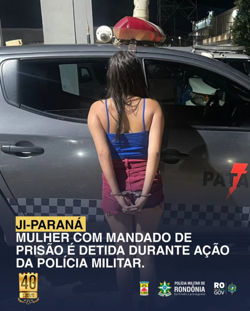 A Polícia Militar, por meio de uma equipe do PATAMO, realizou a detenção de uma mulher com mandado de prisão em aberto durante o atendimento de uma ocorrência no município de Ji-Paraná.