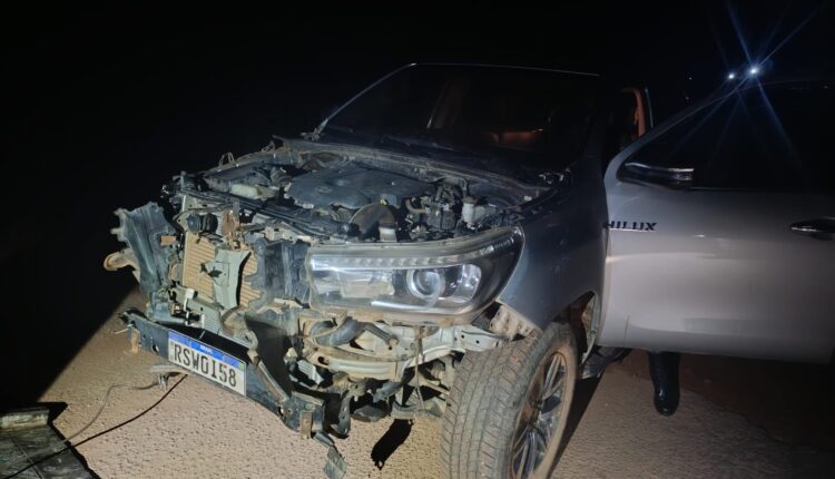 Durante patrulhamento ostensivo realizado na zona rural de Ji-Paraná, nas proximidades do aeroporto, na noite da última quinta-feira, 30, uma guarnição do grupamento do distrito de Nova Colina localizou uma caminhonete Toyota Hilux estacionada de forma suspeita à margem da via, sem o capô e as carenagens dianteiras.