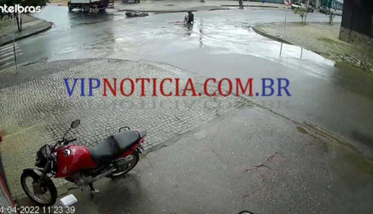 Um caminhão baú cruzou a via, sentido Av. Maringá, e naquele momento é possível ver um motociclista deslizando na pista que está bastante molhada, o caminhão