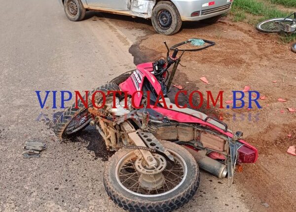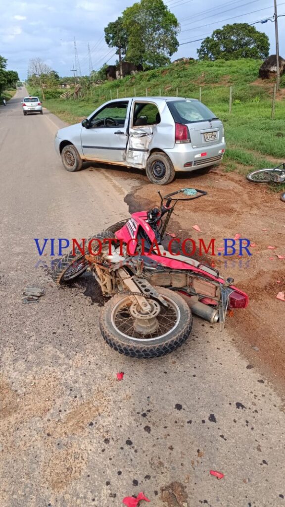 O acidente envolvendo carro e moto aconteceu na Estrada do Aeroporto, próximo ao frigorífico Distriboi.