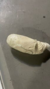 Durante a busca domiciliar, foram localizados um carregador de pistola calibre .40 desmuniciado, escondido dentro de uma bolsa, e um invólucro contendo substância esbranquiçada, aparentando ser cocaína, oculto no forro da casa.