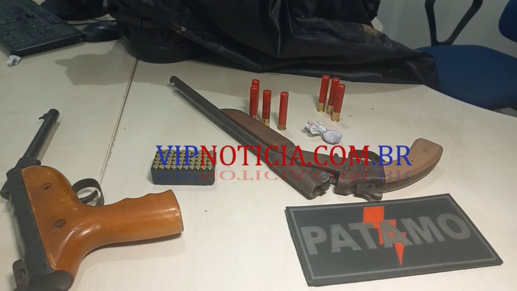 Os policiais foram até a região do matagal encontraram a referida sacola que ao ser averiguada foram encontradas duas armas de fogo, sendo uma calibre 22 e outra 36, com várias munições.