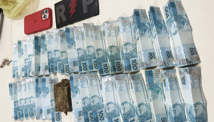 Com o apoio de uma segunda guarnição, o indivíduo foi contido e algemado. Durante a revista pessoal, foi localizado um tablete de substância análoga à maconha, com peso aproximado de 100 gramas, além da quantia de R$ 3.516,00 em dinheiro.
