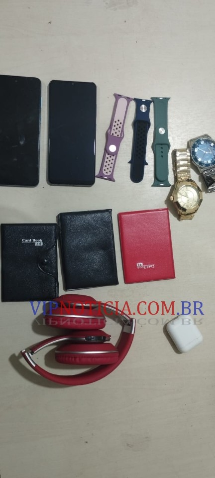 Bonés, cintos, carteiras, dois celulares, roupas masculinas e femininas, entre outros objetos de procedência a serem comprovadas. (Fotos).