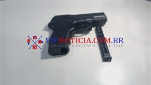 O objeto encontrado com o suspeito era um simulacro de arma de fogo, com características idênticas a uma pistola, o que poderia facilmente intimidar as vítimas caso o crime tivesse sido consumado.