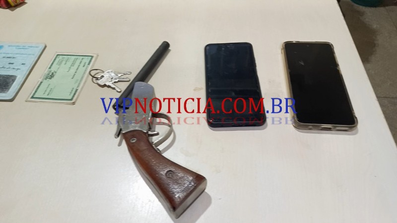 Foi localizado na casa com os elementos, a garrucha calibre 22 usada no assalto, motocicleta e o dinheiro tomado da frentista, cerca de 200 reais.