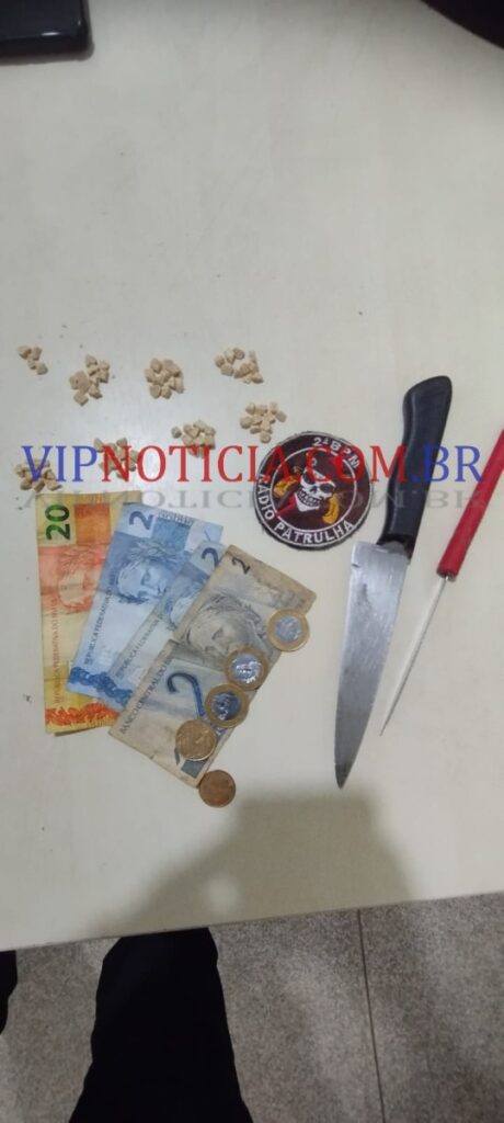Diante da atitude de suspeita, os policiais realizaram a abordagem e localizaram no bolso de Ademilson, que já faz uso de Tornozeleira, 74 pedras de crack embaladas em sacolas plástica pontas para comercialização, e também ele portava uma faca.