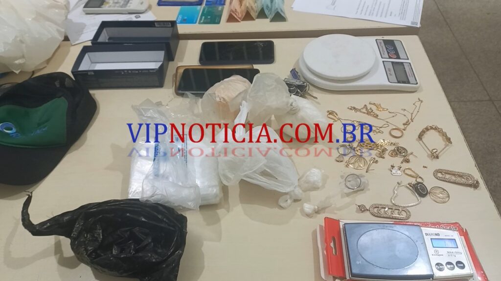 Já no apartamento do abordado os policiais encontraram a quantia de 514 gramas de entorpecente aparentemente Crack, 02 balanças, caixa de um aparelho celular, joias pertencentes ao roubo do qual originou o mandado de prisão preventiva, com um detalhe bem específico, na gargantilha há o nome da vítima, além de uma motocicleta Yamaha Lander de cor preta que estava estacionada em frente ao apartamento.