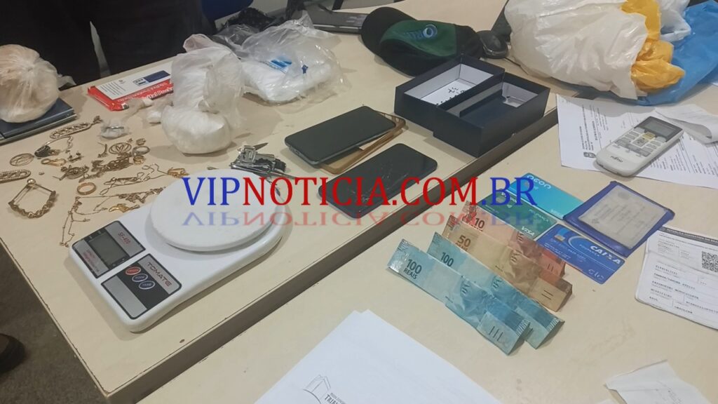 Já no apartamento do abordado os policiais encontraram a quantia de 514 gramas de entorpecente aparentemente Crack, 02 balanças, caixa de um aparelho celular, joias pertencentes ao roubo do qual originou o mandado de prisão preventiva, com um detalhe bem específico, na gargantilha há o nome da vítima, além de uma motocicleta Yamaha Lander de cor preta que estava estacionada em frente ao apartamento.