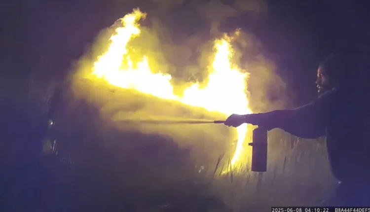 “O policial Nicholas Contino foi o primeiro a chegar ao local. Ele entregou seu extintor a um motorista que passava pela área e trabalhou para localizar o condutor do veículo”, explicou a polícia.