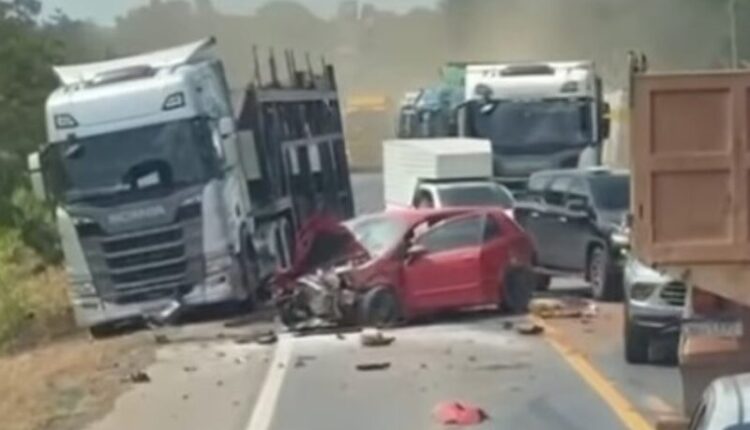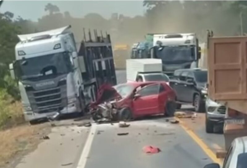 Um acidente registrado no km 412 da BR-364, em Jaru, deixou um Fiat Punto completamente destruído após colisão envolvendo dois veículos de passeio e um caminhão cegonha. O acidente ocorreu no sentido decrescente da rodovia.