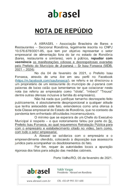 A abrasel (associação brasileira de bares e restaurante) por meio do seu representante em Rondônia repudiou as ofensas feita pelo prefeito de Ji-paraná.
