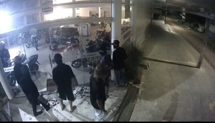 Em uma ação ousada sete elementos encapuzados invadiram nesta quarta-feira (27), a concessionaria de motocicletas Rondo Motos, quebrando a porta de vidro e subtraindo quatro motocicletas.