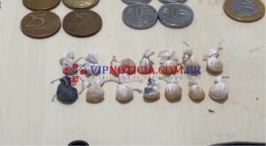 Durante a abordagem e revista pessoal, os policiais localizaram 14 pedras de substância análoga ao crack, além de R$ 4 em moedas. Segundo a polícia, a droga estava fracionada e guardada dentro de uma carteira de cigarro adaptada, sem a parte superior e sem cigarros, forma que facilitaria a retirada rápida das pedras durante a venda.