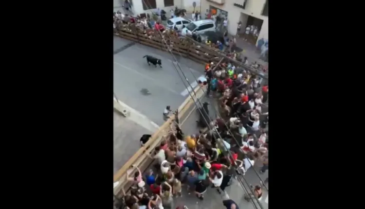 Um touro conseguiu quebrar as barreiras de um recinto em Alcalá del Júcar, Albacete, Espanha, na sexta-feira, atingindo várias pessoas que estavam no local.