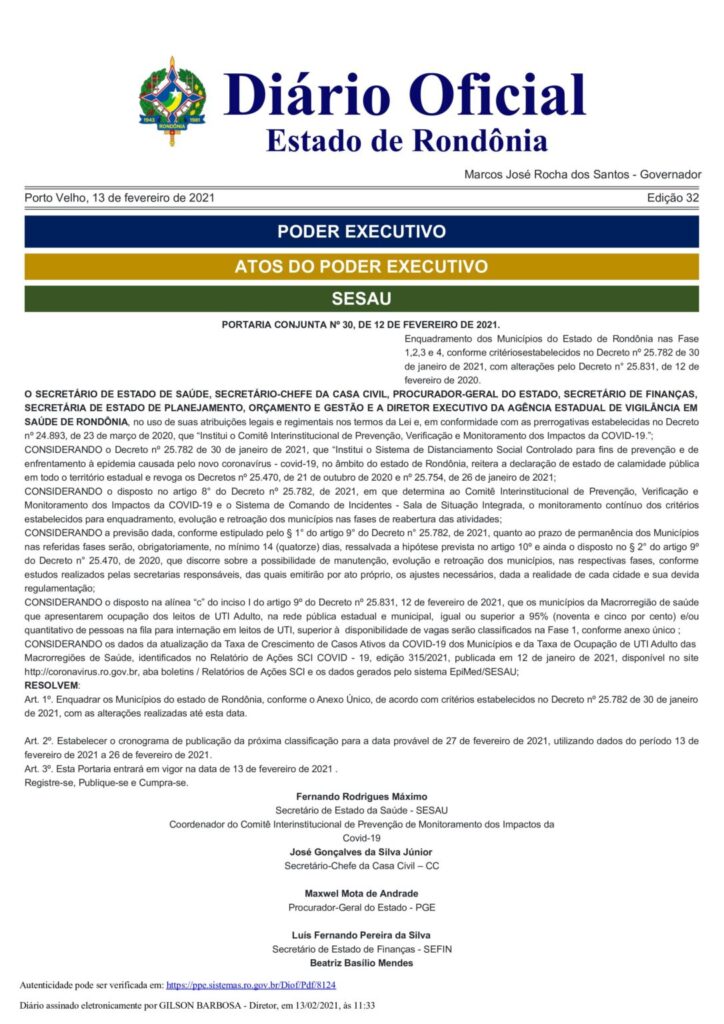URGENTE – 52 municípios de Rondônia entram na Fase 1 do plano de ação contra Covid-19 DestaquesNotícias do BrasilRondônia Share O Governo de Rondônia, acaba de publicar a decisão que enquadra os 52 municípios de Rondônia na fase 1 do plano de ação de combate à Covid-19 “Todos por Rondônia”. Share