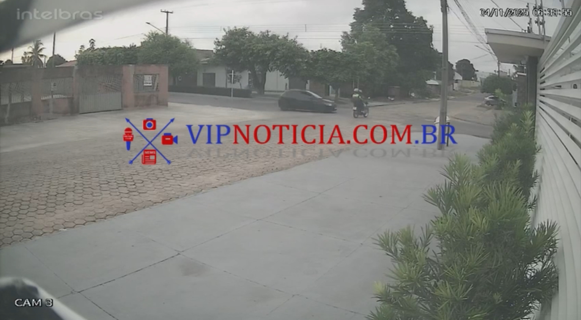 Imagens de câmeras de monitoramento flagraram o momento exato da colisão registrada na manhã da última terça-feira (4), no cruzamento da Rua Goiânia com a T-8, em Ji-Paraná (RO). O acidente envolveu um Chevrolet Onix e uma motocicleta Yamaha Factor, deixando o condutor e sua filha — que estava na garupa — feridos.