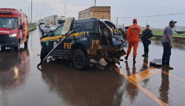 Um dos vídeos compartilhados mostra as avarias na viatura e destroços do veículo espalhados pela pista da rodovia federal, enquanto outros agentes da PRF atendem a ocorrência envolvendo os colegas de farda.