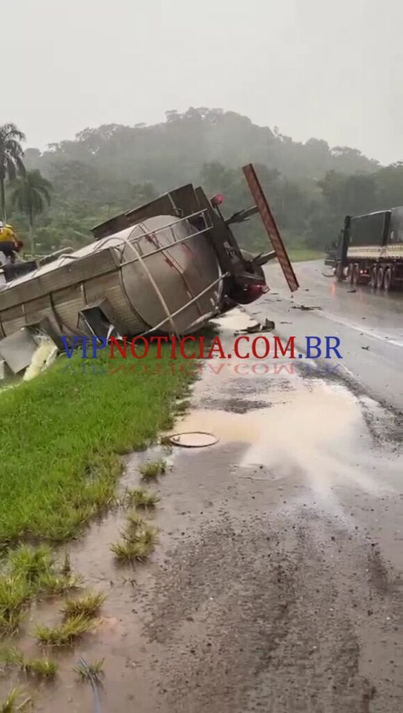 O caminhão com tanque de leite tombou à margem da rodovia federal, o caminhão caçamba foi parar no canteiro do outro lado. Vídeo mostra o leite que continha no tanque derramando na grama, e como ainda chove não há muito que fazer.