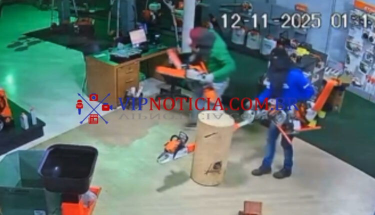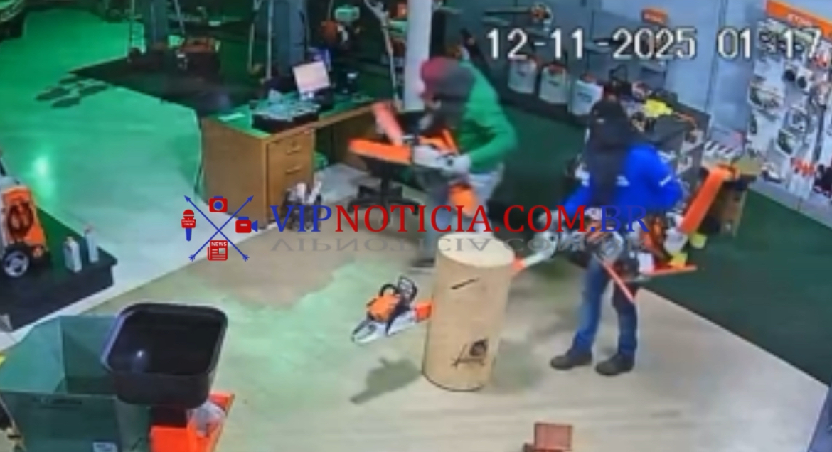 Pouco tempo depois, os criminosos utilizaram a Kombi furtada para praticar o segundo furto, desta vez em uma loja de produtos agrícolas. Imagens de câmeras de segurança mostram dois homens chegando com o veículo, arrombando a porta do comércio e fugindo com cerca de 18 motosserras.